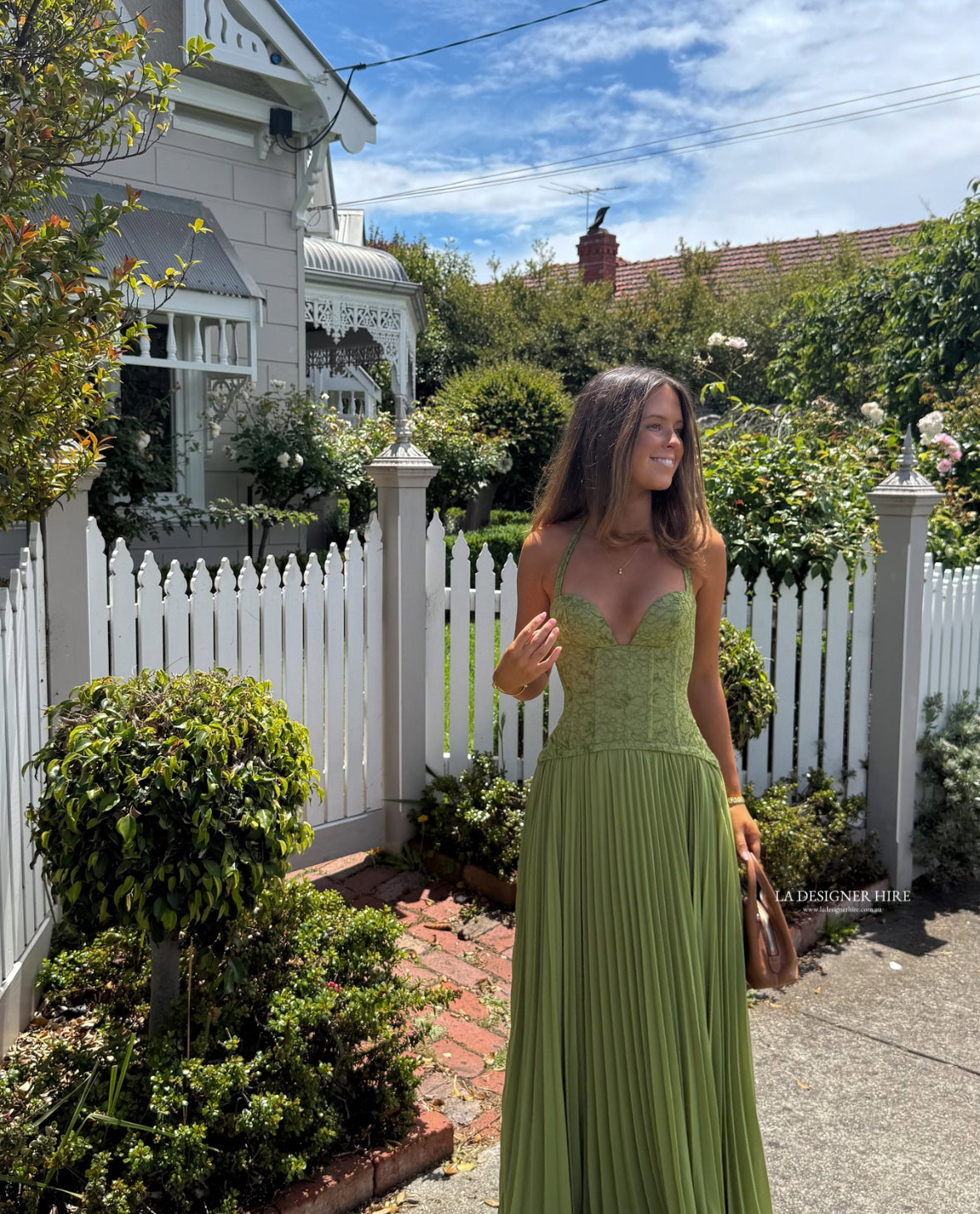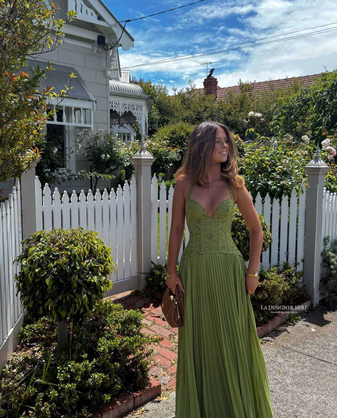 The Fenity Gaia Dress comes in a rich green tone, featuring our signature floral lace on the top part with boning and a snatching corset. The pleated skirt drapes effortlessly, moving with a soft, graceful flow. Guaranteed to be the most unique dress in the room, made to steal the spotlight.