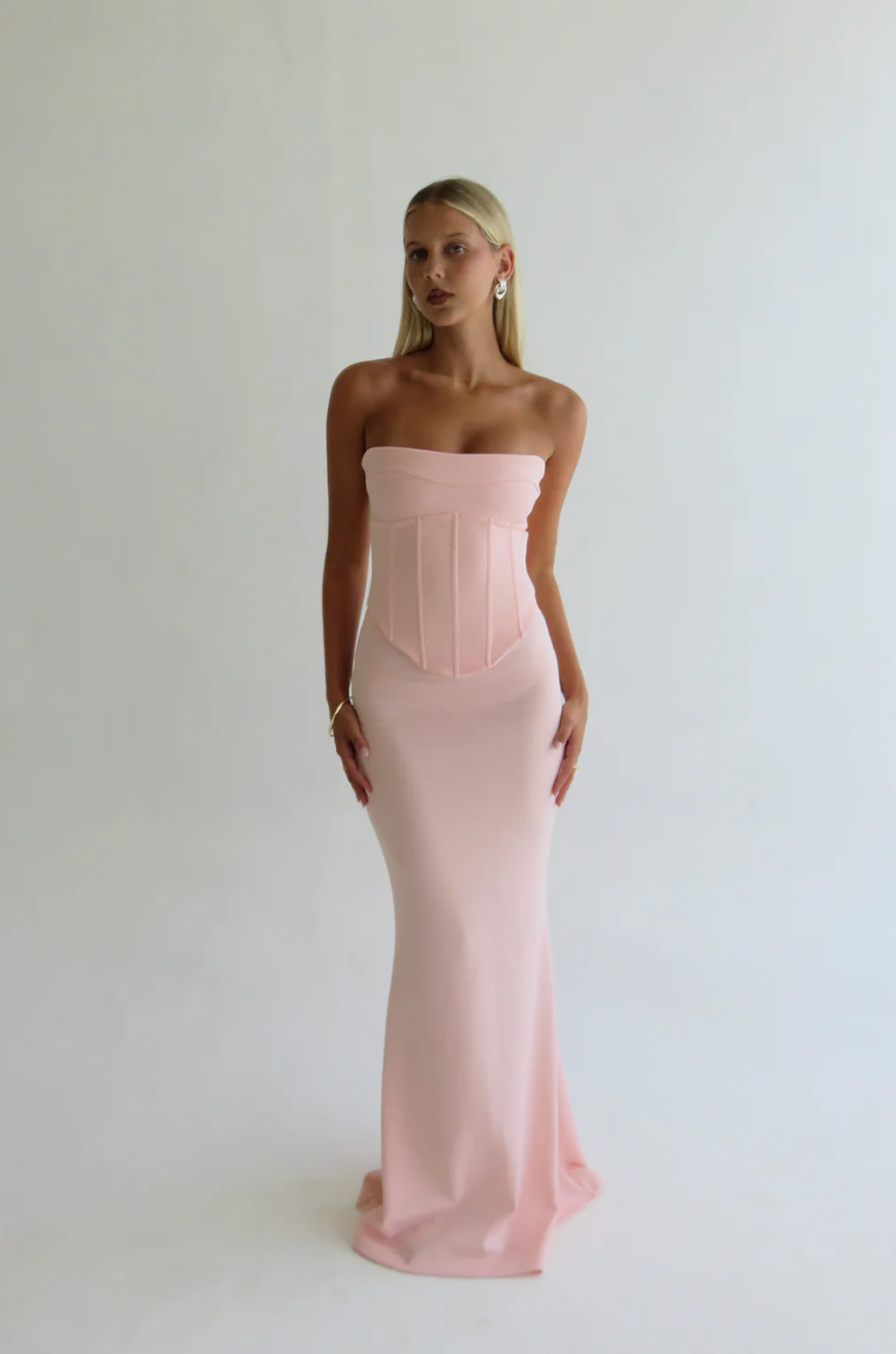 Introducing the Louie Gown in Baby Pink, a stunning two-piece gown by HNTR the Label. Featuring a structured corset top and maxi skirt crafted from luxurious buttery fabric, this gown combines style and comfort. Elevate your next event look with this elegant and versatile piece that exudes sophistication and charm.
